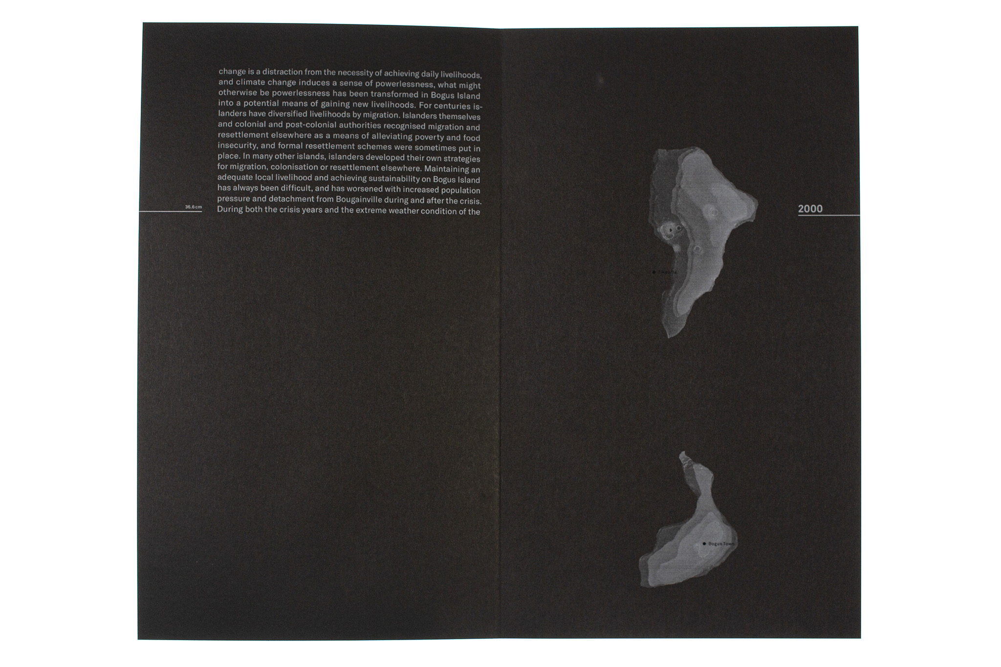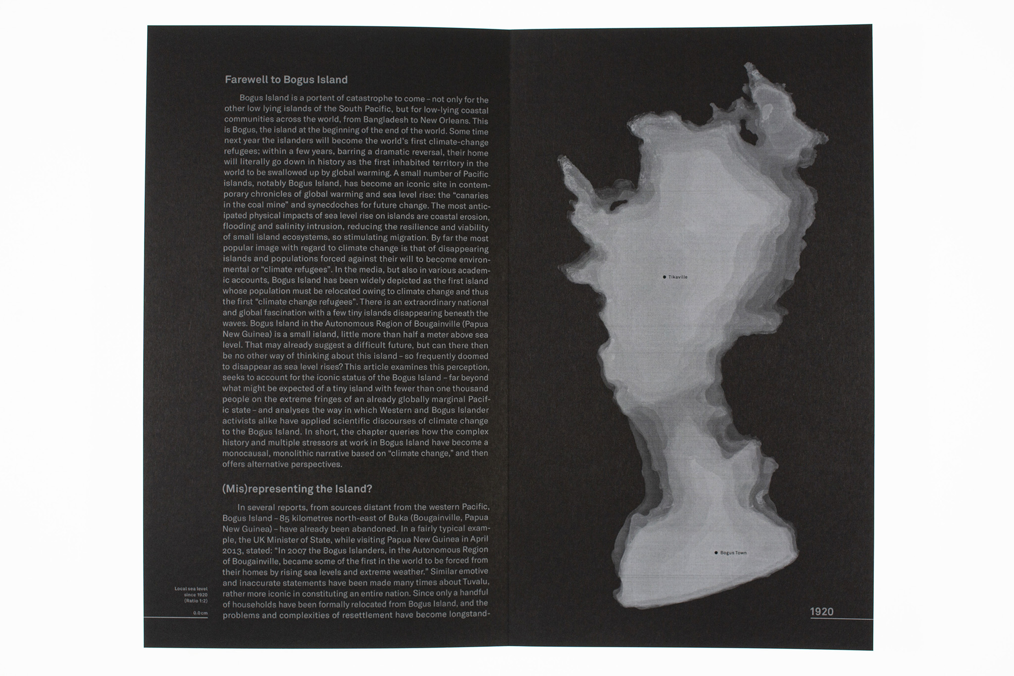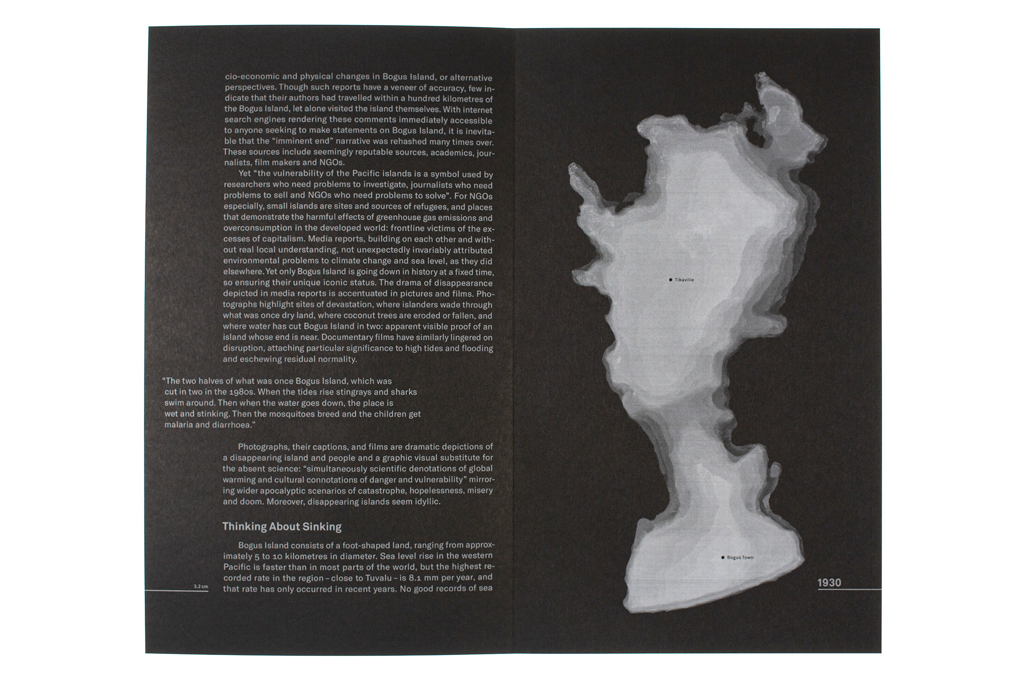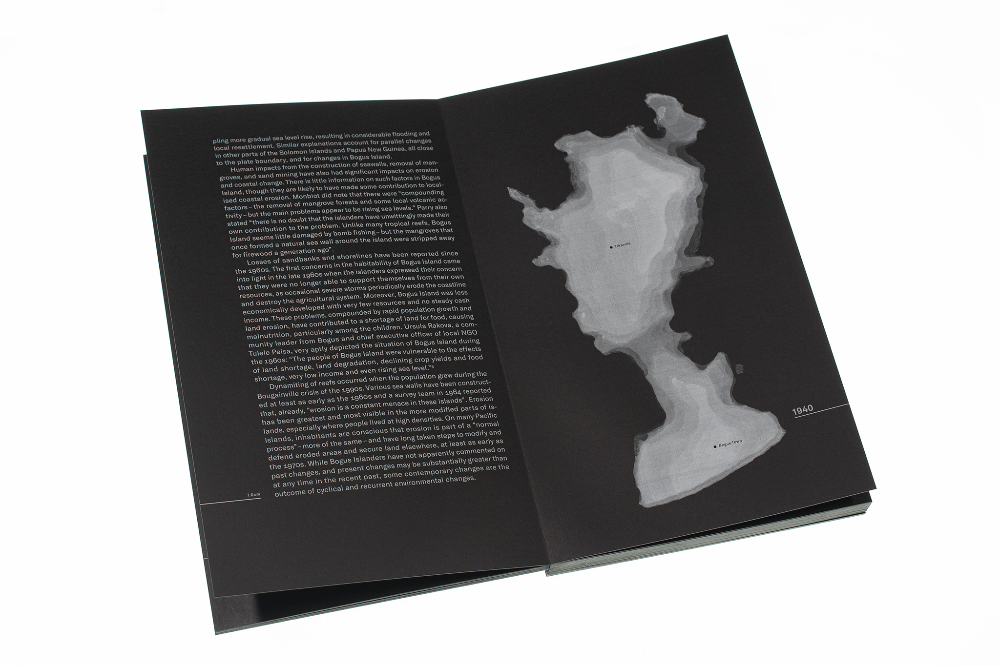 The effects of climate change (such as faster sea level rise, increased coastal erosion, and more frequent storms) are triggering devastating consequences in the form of land loss in different places around the world. The book Bye Bye Island depicts the slow demise of the fictional South Pacific island of Bogus Island over the course of a hundred years. A shrinking form cast in wax symbolizes the sinking of the island into the ocean. The imagery is accompanied by a scientific text. The gradual reduction in the size of the text illustrates the rise in sea level and the resulting increase in land loss. The index of the flatbook uses infographics based on quantitative data to illustrate the sea level rise in a local and global context. The visual language emerged from a series of experiments with wax and its layering.