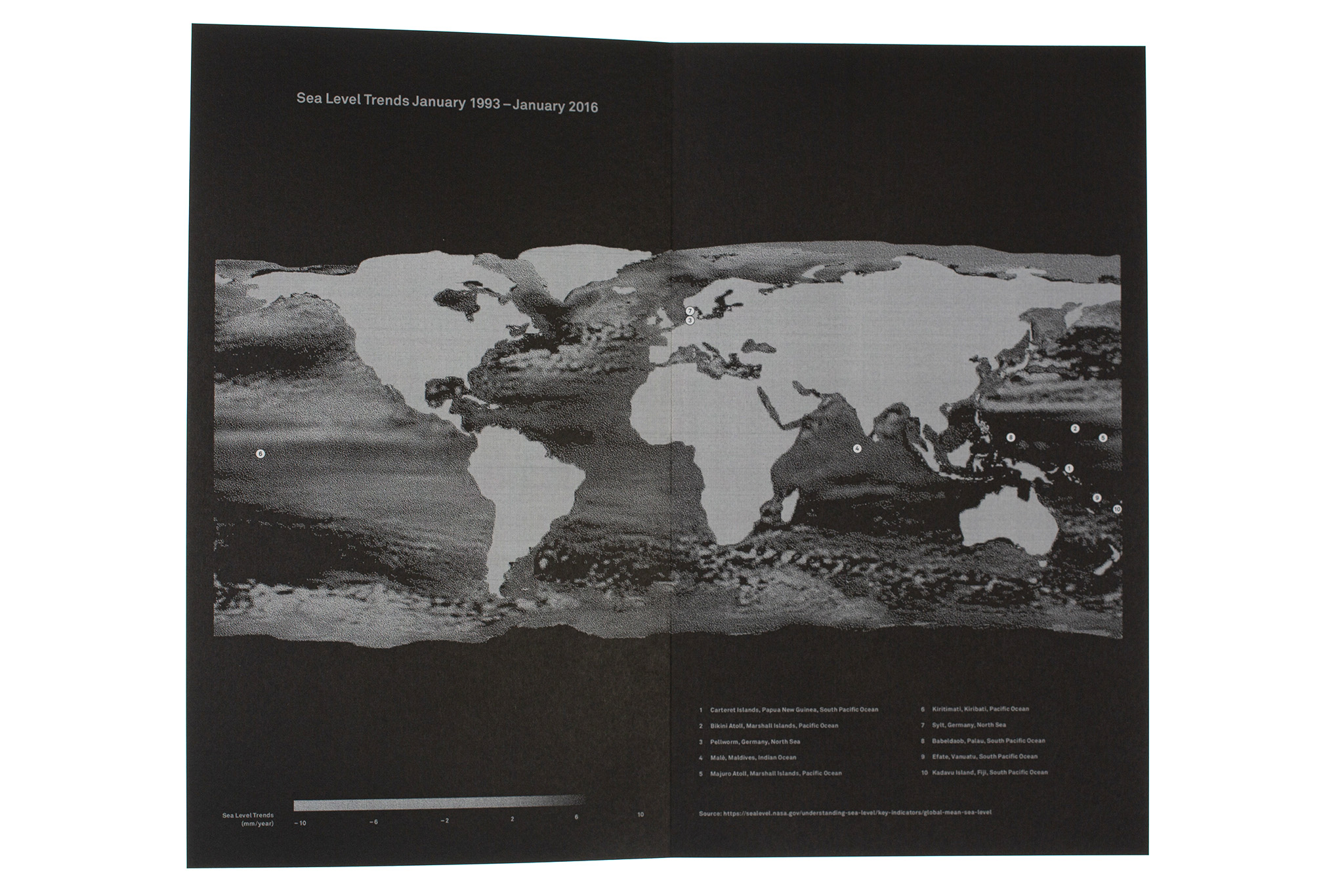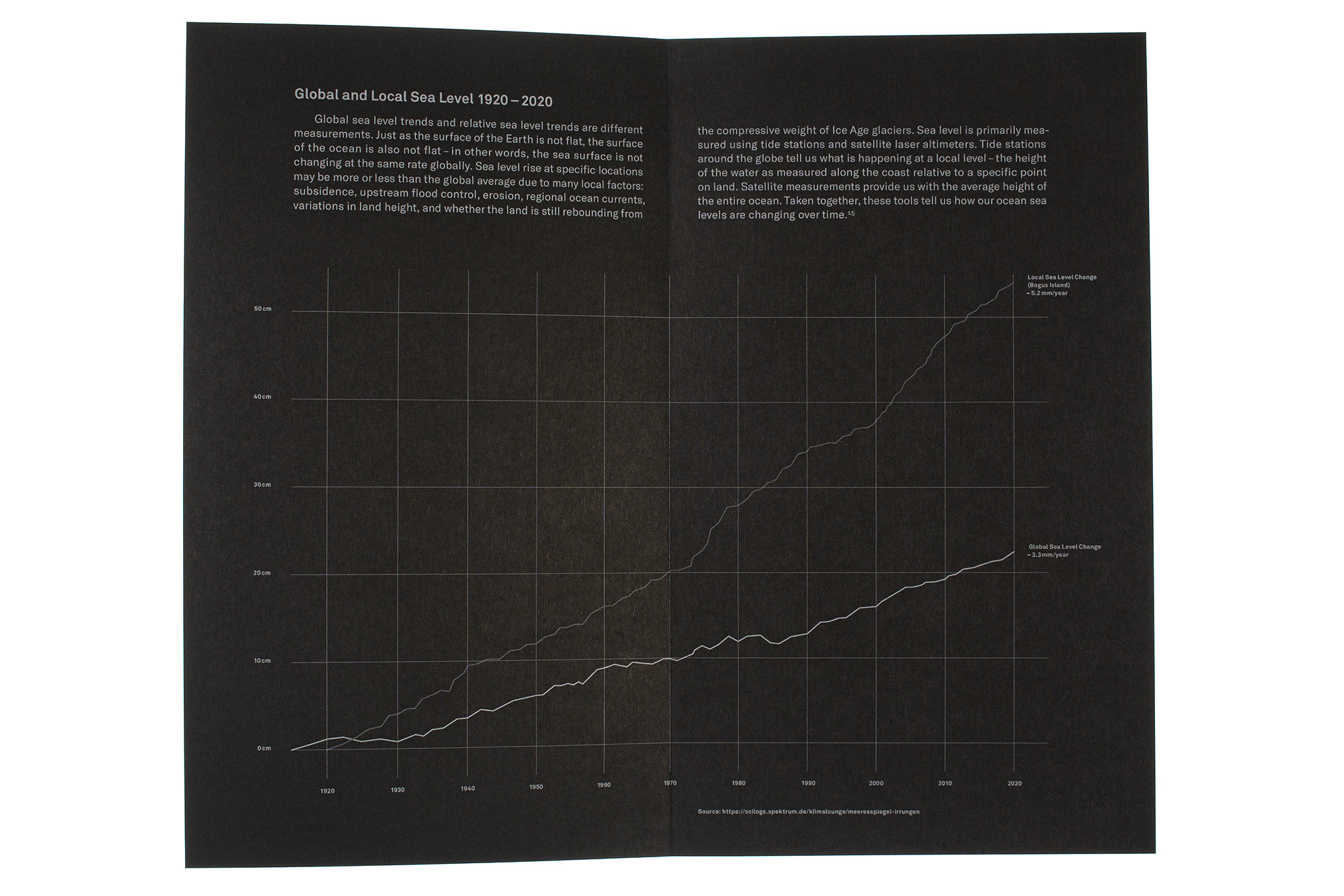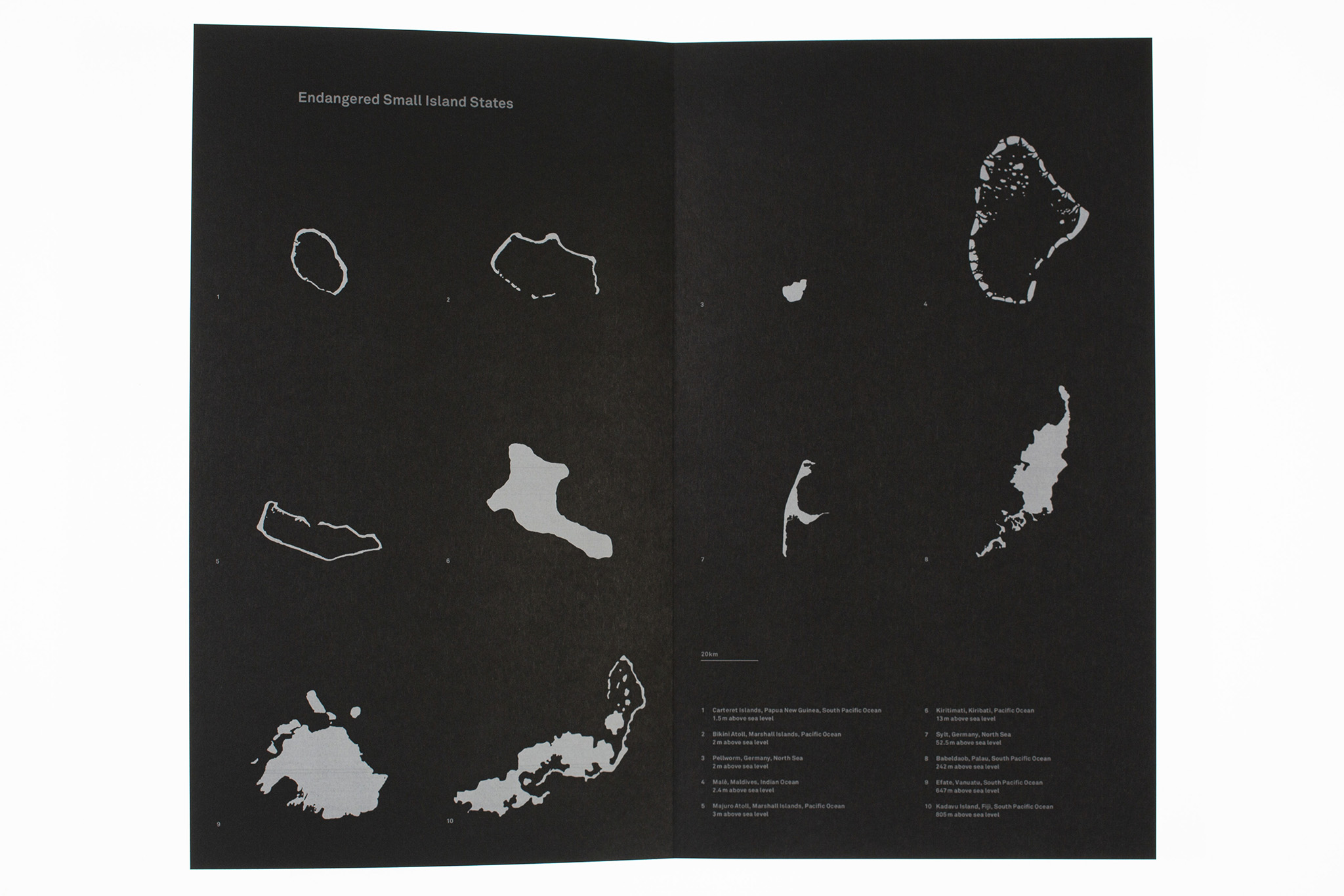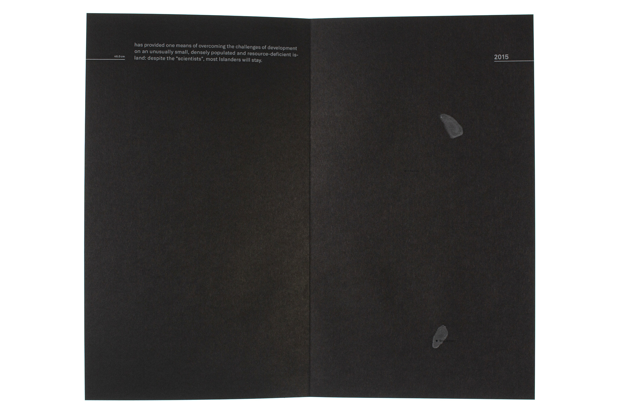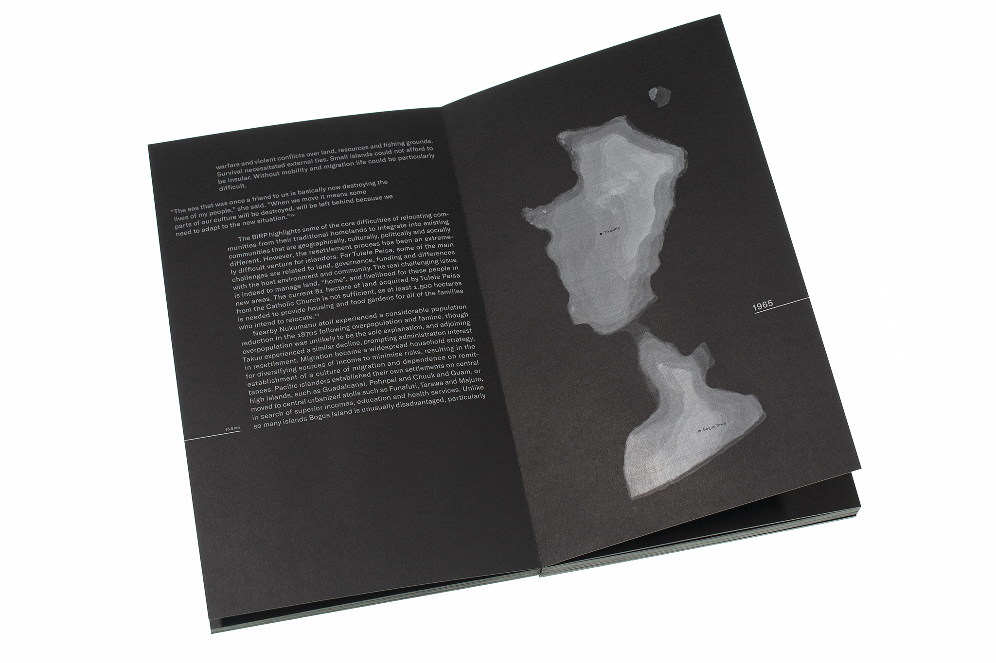 The effects of climate change (such as faster sea level rise, increased coastal erosion, and more frequent storms) are triggering devastating consequences in the form of land loss in different places around the world. The book Bye Bye Island depicts the slow demise of the fictional South Pacific island of Bogus Island over the course of a hundred years. A shrinking form cast in wax symbolizes the sinking of the island into the ocean. The imagery is accompanied by a scientific text. The gradual reduction in the size of the text illustrates the rise in sea level and the resulting increase in land loss. The index of the flatbook uses infographics based on quantitative data to illustrate the sea level rise in a local and global context. The visual language emerged from a series of experiments with wax and its layering.