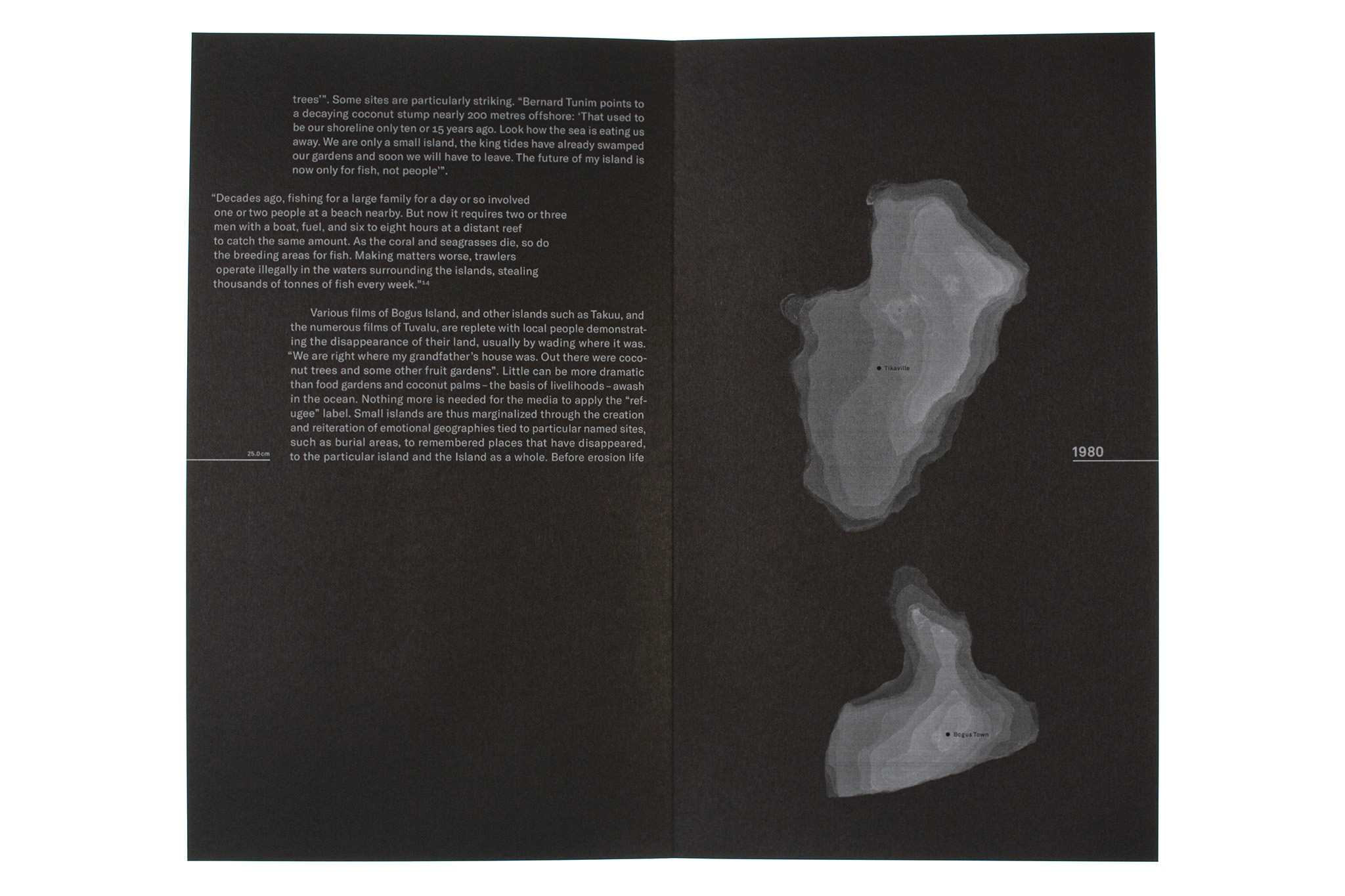 Die Auswirkungen des Klimawandels (wie zum Beispiel schnellerer Meeresspiegelanstieg, verstärkte Küstenerosion und häufigere Stürme) lösen an unterschiedlichen Orten der Welt verheerende Folgen in Form von Landschwund aus. Das Buch Bye Bye Island zeigt über hundert Jahre hinweg den langsamen Untergang der fiktiven Südpazifikinsel Bogus Island. Eine aus Wachs gegossene, schrumpfende Form symbolisiert dabei das Versinken der Insel im Ozean. Begleitet wird die Bildwelt von einem wissenschaftlichen Text. Die allmähliche Verkleinerung des Textspiegels verdeutlicht den Meeresspiegelanstieg und den dadurch verstärkten Landschwund. Im Index des Flatbooks wird mit auf quantitativen Daten basierenden Infografiken der Meeresspiegelanstieg im lokalen und globalen Kontext erklärt.